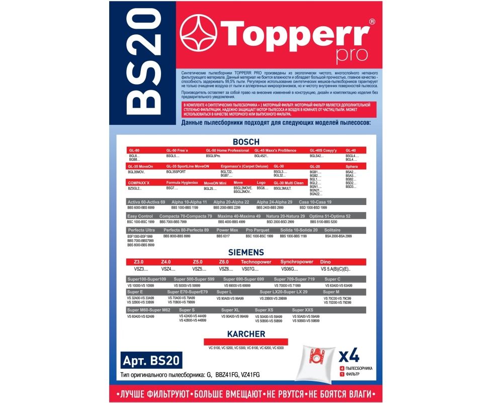 Для пылесосов BOSCH: Serie 4: BGLS 48…; Serie 6: BGL6…; BGB6...; GL-80 BGL8...; Ergomaxx'x (Carpet Deluxe) BGB7...; GL-40S Cosyy'y BGLS42...; MoveOn Vini BGL25...; GL-50 Free`e BSGL5…., Home Professional BSGL5Pro.; GL-45 Maxx'x ProSilence BGL4521..; GL-40 BSGL4…., BGL4....; GL-30 BSGL3…., GL-30 MultiClean BSGL3MULT., GL-30 BGL32..., GL-35 MoveOn BGL35MOV..; Compaxx`x BZGL2A31.; GL-20 BGN22.., BGN21..., BGL1..., BGL2..., BGB1..., BGB2...; Formula Hygienixx BSG7….; Logo BSG6….; Move BSGL2MOVE., BSGL2MOV..; Sphera BSA2…, BSA3…, BSD2…, BSD3…; BSG2...; BSG4...; BSF1...; BSD1...; BSC1...; BBS8...; BBS7...; BBS6...; BBS5...; BBS2...; BBS1..., BSB2... (4 шт. +ф, ориг.тип G, BBZ41FG, VZ41FG).