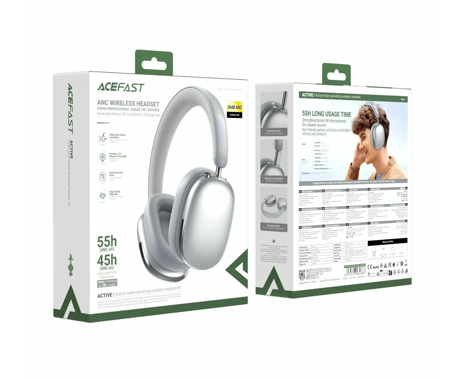 Наушники ACEFAST H9 active noise cancelling wireless headset Silver
