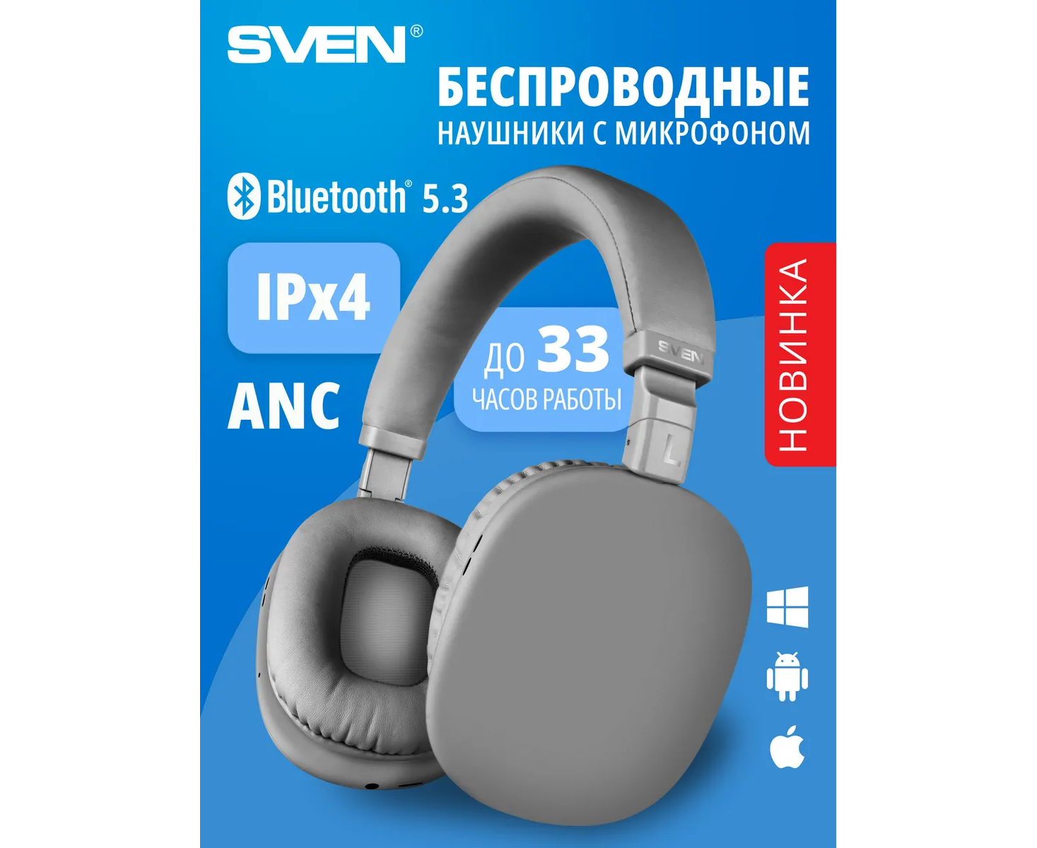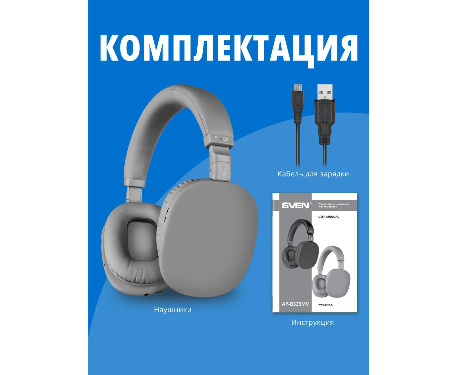 Наушники bluetooth полноразмерные с микрофоном SVEN AP-B325MV, серый