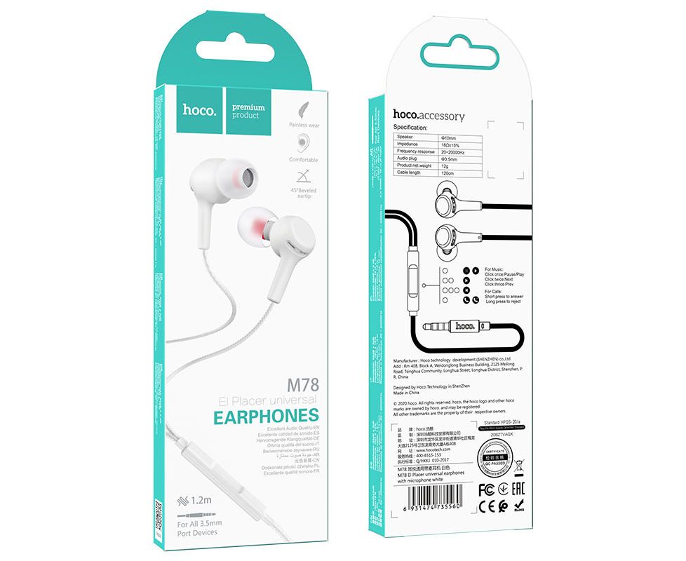 Наушники HOCO M78 El Placer universal earphones with microphone (белый)