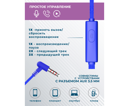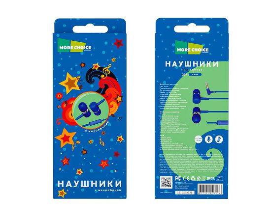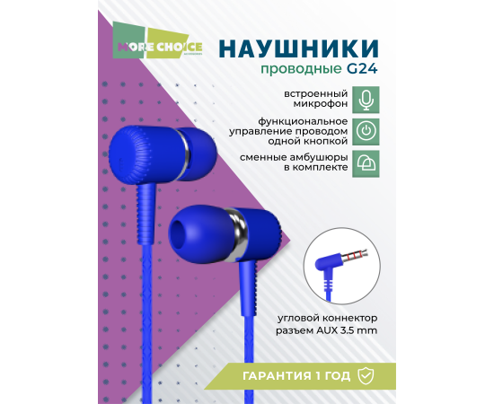 Наушники вакуумные AUX разъём с МК без рег.громкости длина 1.1м More choice G24 (Blue)