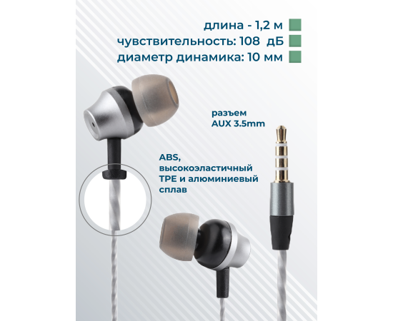 Материал: ABS-пластик, TPE, алюминиевый сплав Тип наушников: вакуумные, проводные Динамик: 10 мм Разъём: miniJack 3,5 мм Длина кабеля: 1,2 м Пульт ДУ: микрофон, регулировка громкости, старт/пауза, ответ на звонок, селфи Комплектация: наушники, две пылезащитные заглушки для разъема AUX, кольцо-держатель для смартфона, буклет. Цвета: Black, Dark Silver