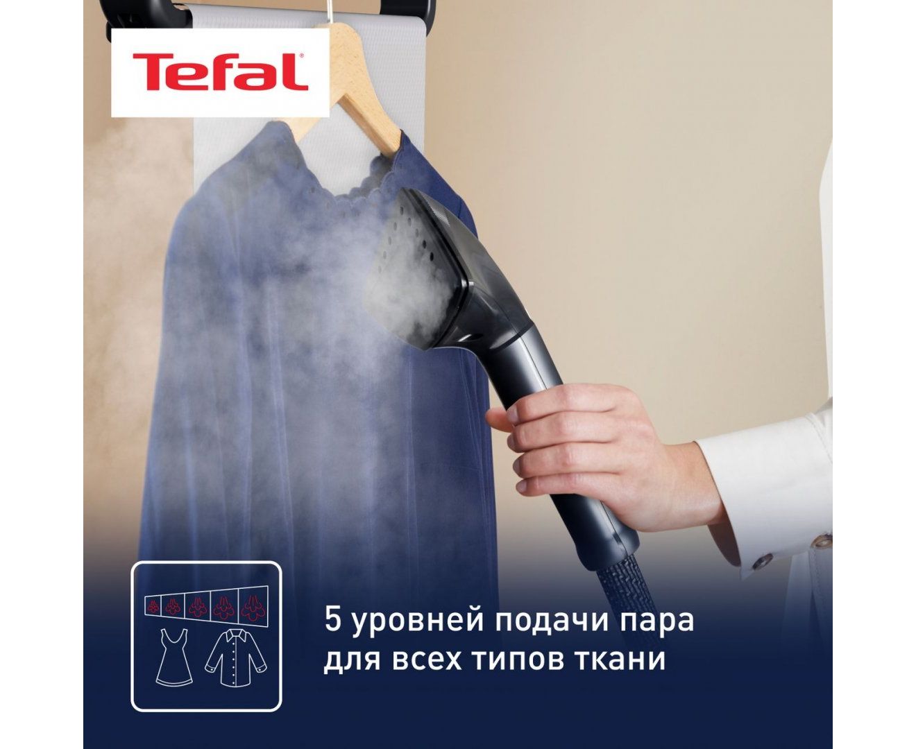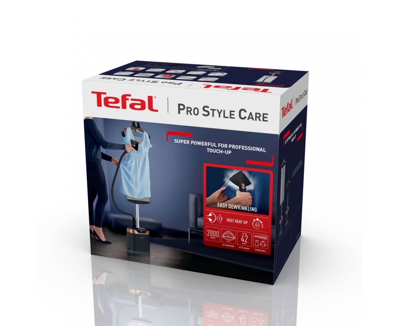 Вертикальный отпариватель Tefal IT8480E1 поддерживает пять режимов. Это позволяет выбрать оптимальные параметры подачи пара в зависимости от особенностей ткани. Сила пара регулируется до 42 г/мин посредством переключателей, расположенных на ручке. Широкая насадка Delta помогает устранять складки даже в труднодоступных местах. Вертикальная поддержка Press & Steam создает дополнительный упор. Одежда не отклоняется под струей пара, что улучшает результат.