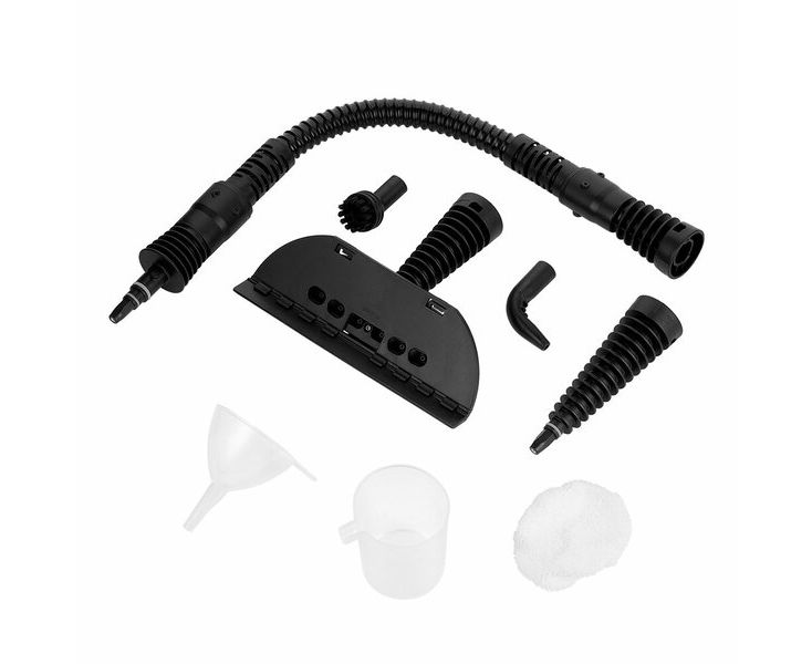 Стакан для воды, съёмный паровой шланг, тряпка для отпаривания, защелка шланга.