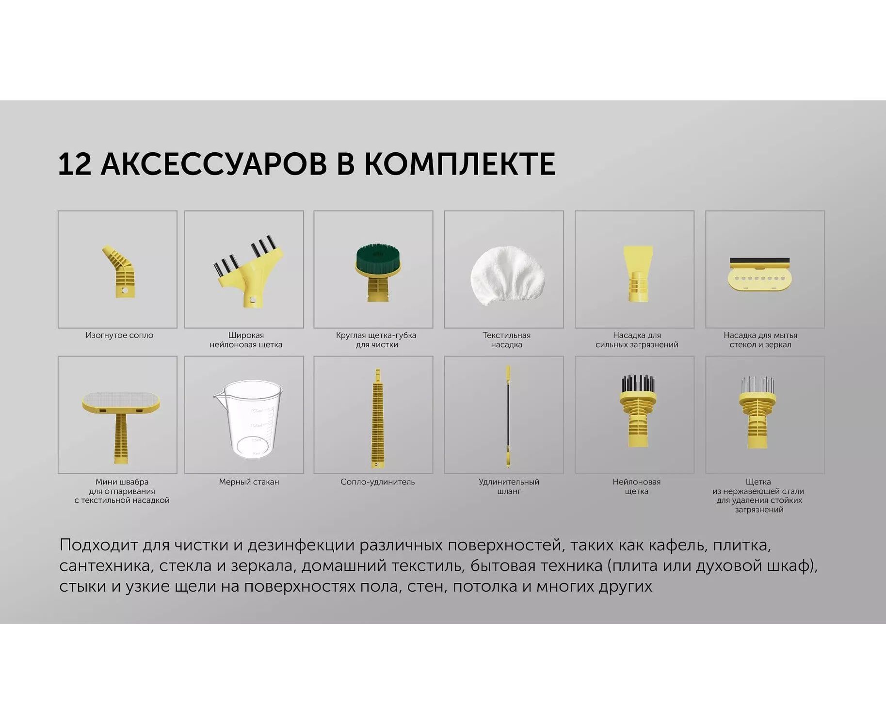 Подходит для чистки и дезинфекции различных поверхностей, таких как кафель, плитка, сантехника, стекла и зеркала, домашний текстиль, бытовая техника (плита или духовой шкаф), стыки и узкие щели на поверхностях пола, стен, потолка и многих других;