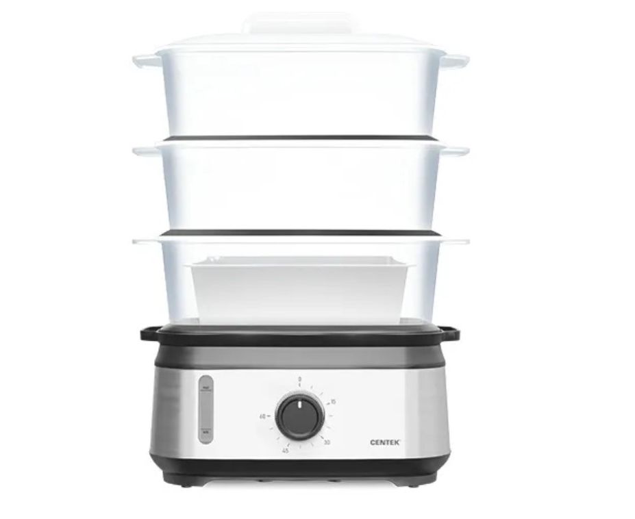 Пароварка Centek CT-1458 мощностью 1050 Вт станет настоящей находкой для поклонников правильного питания или для молодых мам, которые готовят полезный прикорм ребенку. Конструкция устройства состоит из 3 ярусов, а емкость вмещает до 9 л пищи. Каждое из отделений вмещает до 3 л. Корпус прибора изготовлен из нержавеющей стали, а паровые корзины – из пластика. Модель имеет механическое управление и съемные решетки.