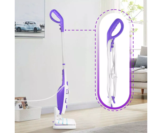 При хранении швабра не займёт много места. Шнур длиной 4,9 м не сковывает и не ограничивает ваше перемещение во время уборки. На ручке и корпусе швабры имеются держатели для смотки шнура.
