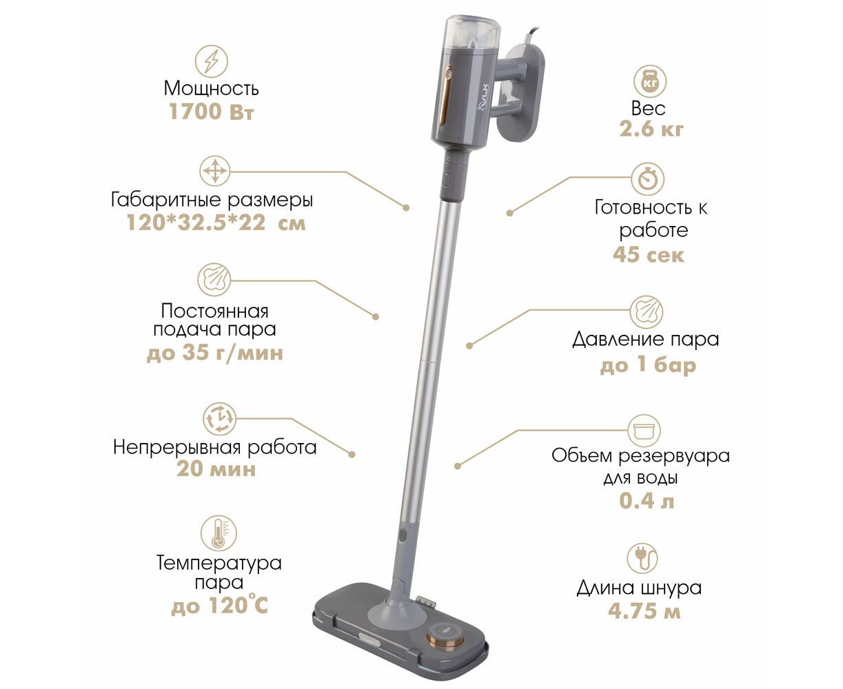 С помощью швабры VLK Rimmini-8200, вы сможете создать идеальную атмосферу в своем доме. До 35 г пара в минуту позволяют эффективно и быстро очищать различные поверхности от грязи, пятен и других загрязнений. А благодаря готовности к работе всего за 45 секунд, вы можете начать уборку практически мгновенно.
