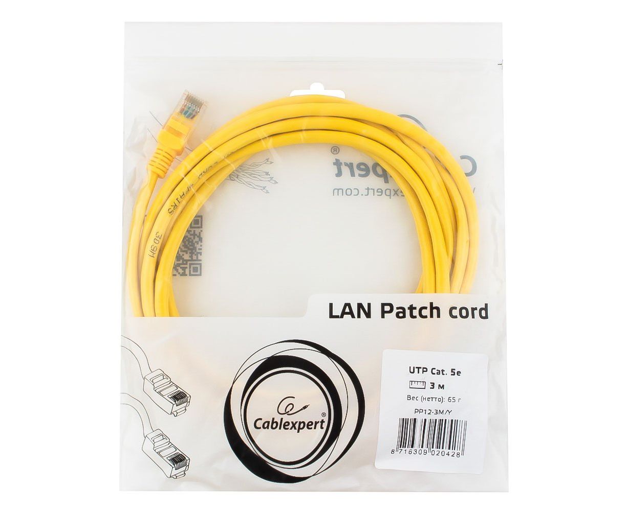 Патч-корд UTP5e, 3 м, литой, многожильный, биметалл CCA, 26AWG, PVC, жёлтый CABLEXPERT PP12-3M/Y