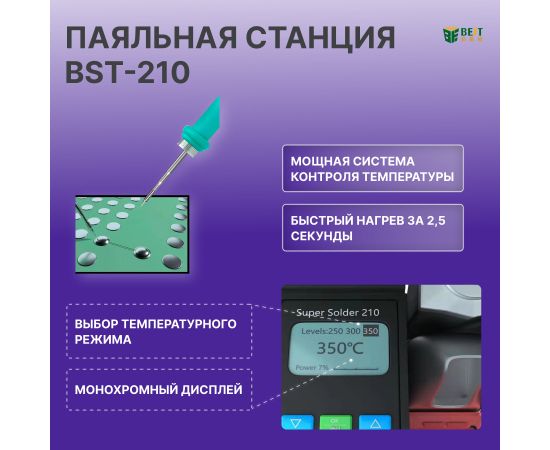 В целом, BST-210 — это надежная и универсальная паяльная станция, подходящая для широкого спектра применений: от ремонта мобильных телефонов до ремонта печатных плат и доработки SMT (технологии поверхностного монтажа).