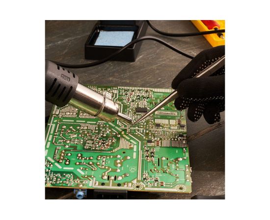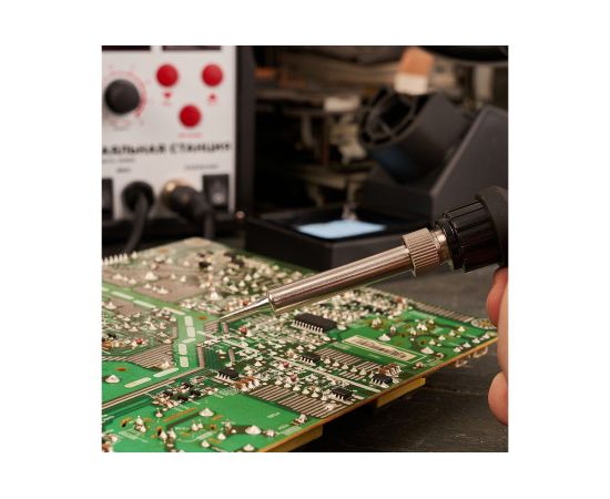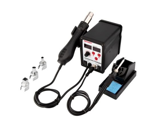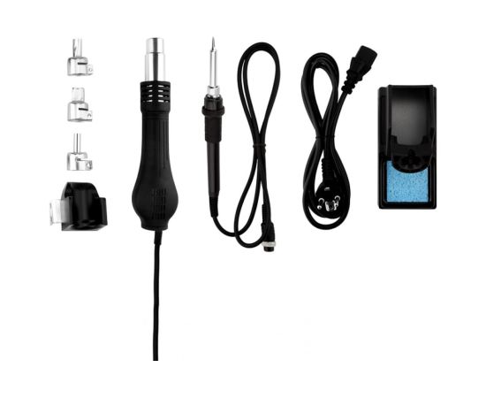 В комплектацию станции входят: основной блок, термофен, паяльник, держатель паяльника, держатель термофена, губка для очистки жала паяльника (в ложементе), а также 3 насадки для термофена 8, 10 и 13 мм.