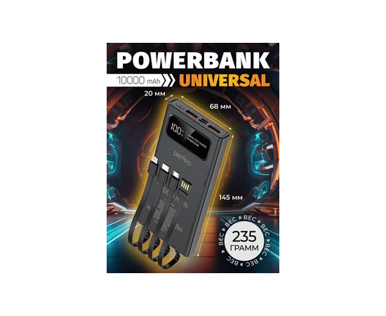 Perfeo Powerbank Universal 10000mah PD+QC3.0/In all/Out USB,Micro usb,Type-C,Lightnin,3А/22.5W/Black