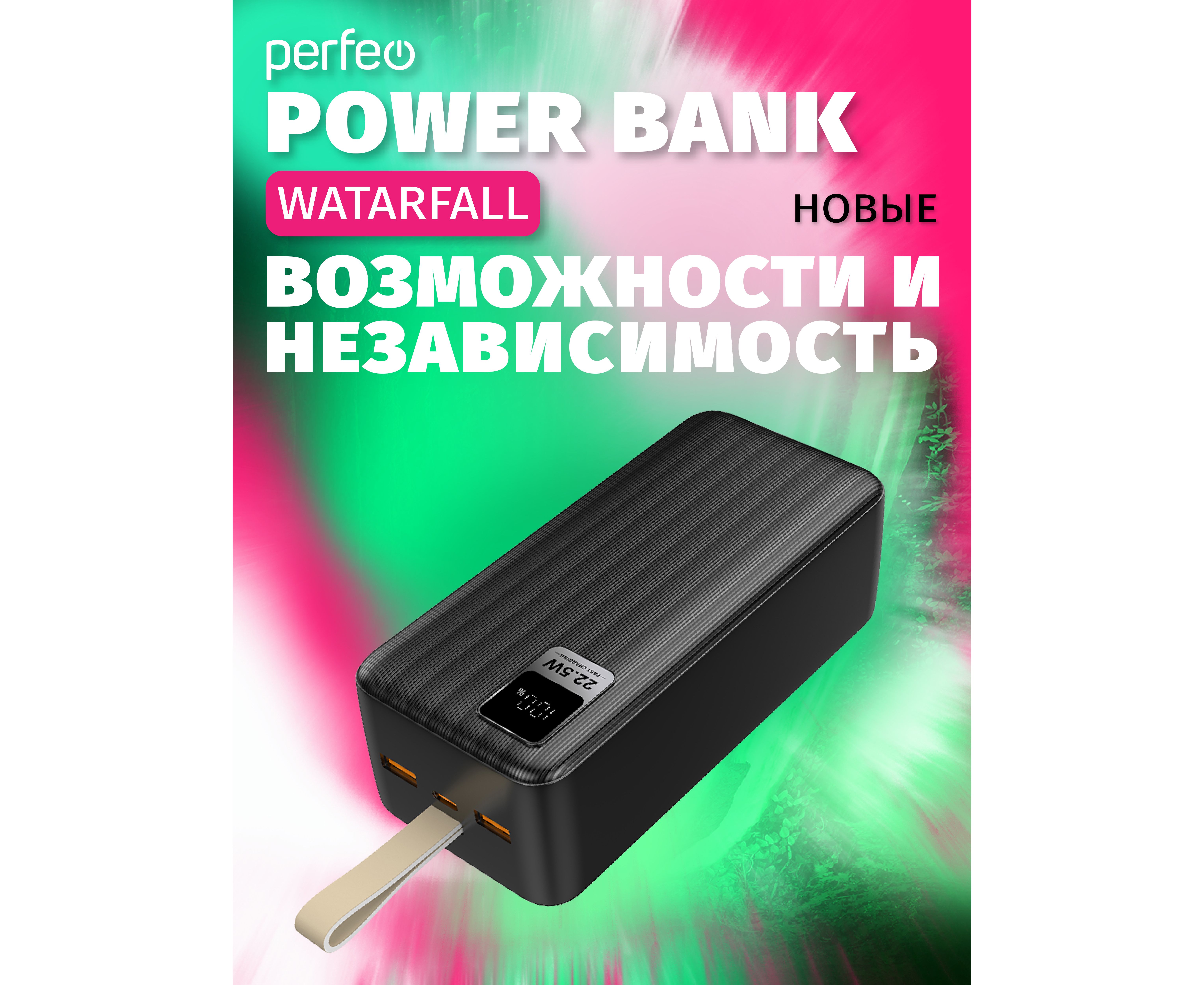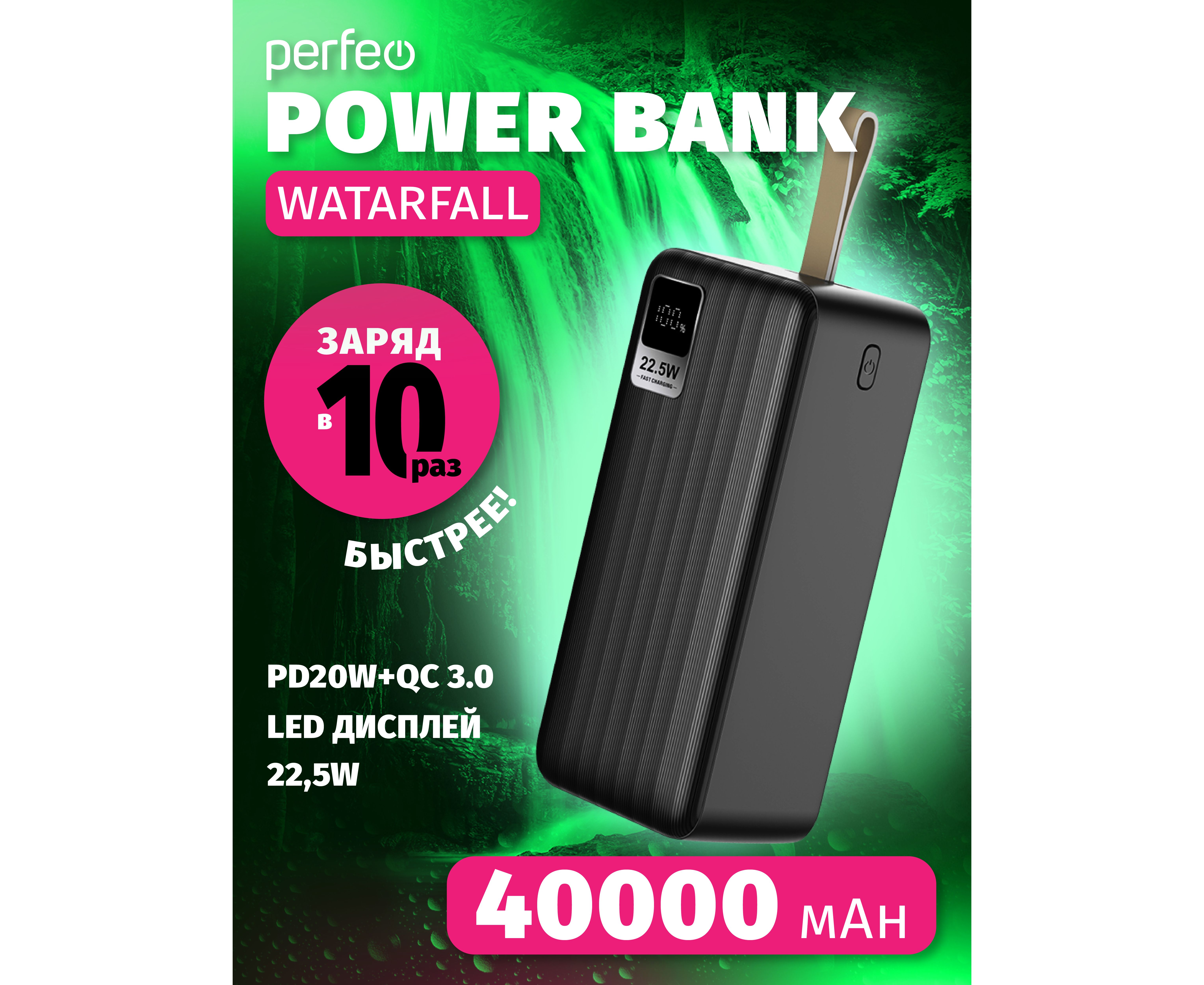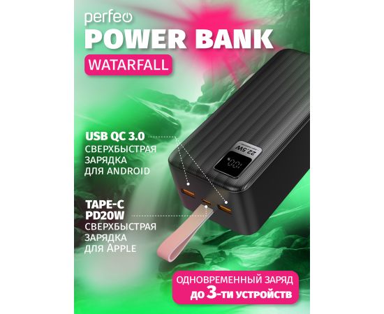 Повербанк Perfeo Powerbank 40000 mAh/LED дисплей/PD + QC 3.0/Type-C/2 USB/Выход: 5A, max 22.5W/черный