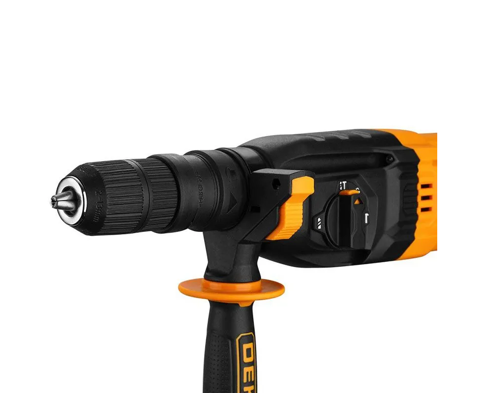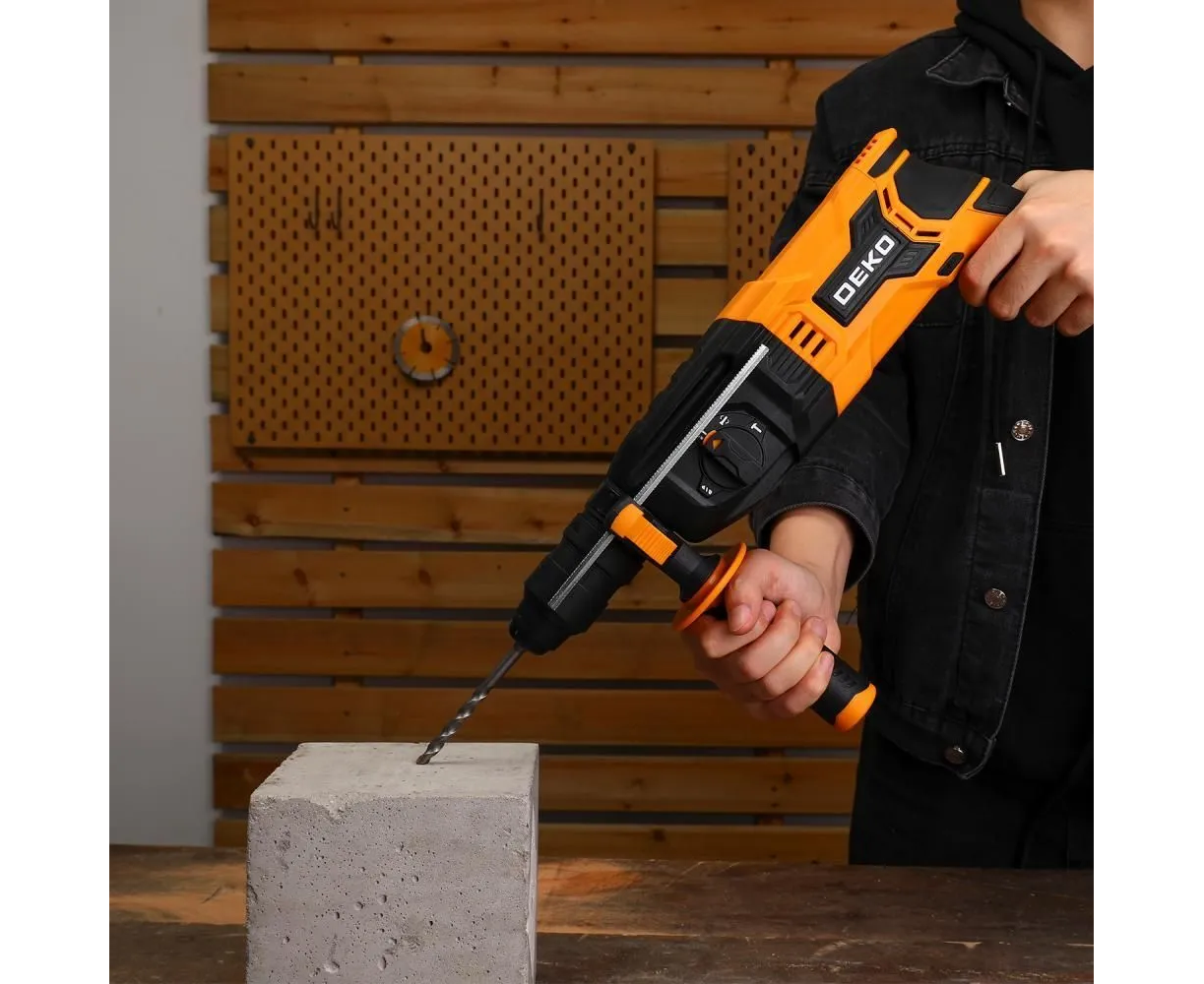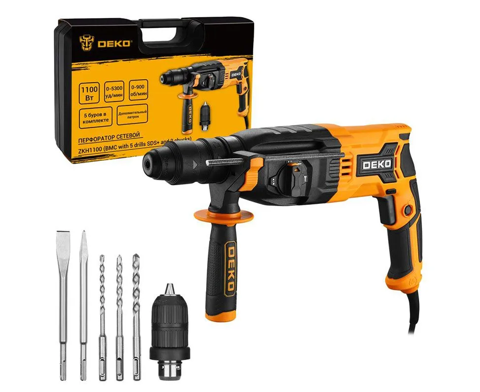 Перфоратор сетевой DEKO ZKH1100 предназначен для сверления отверстия в различных материалах (дерево, бетон, кирпич, сталь и т.д.) в режимах сверления и сверления с ударом, а также ударного долбления при установке соответствующей оснастки.