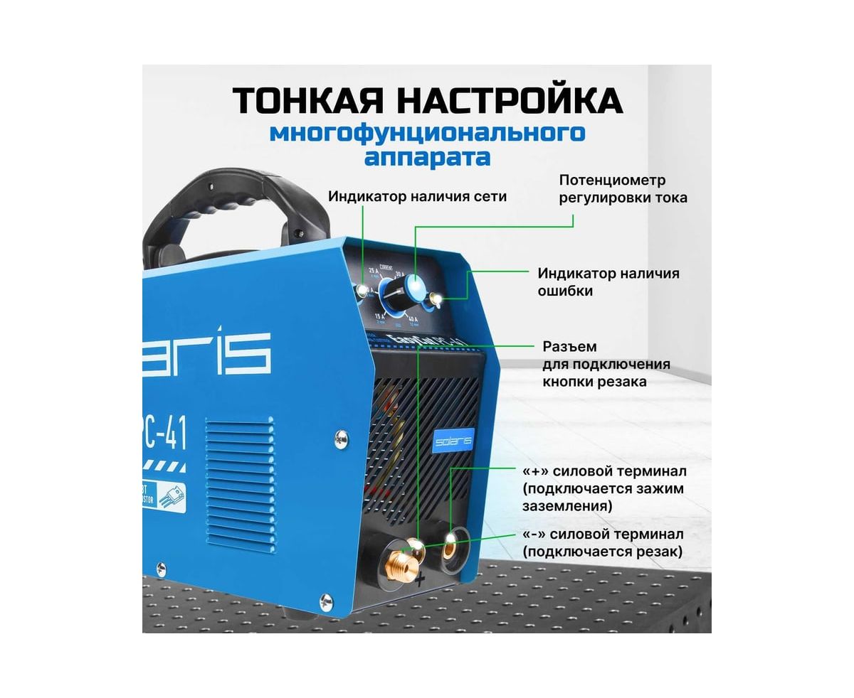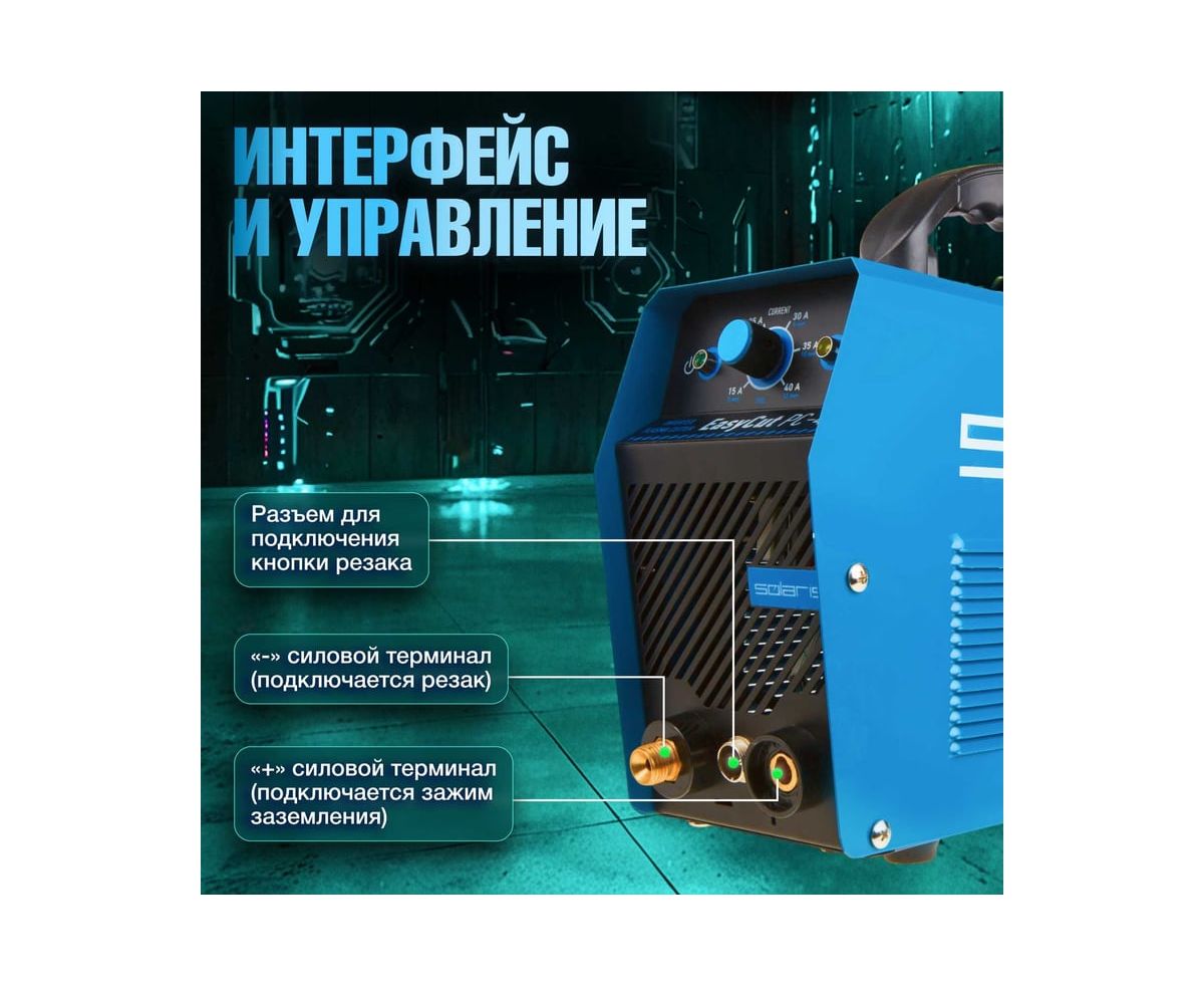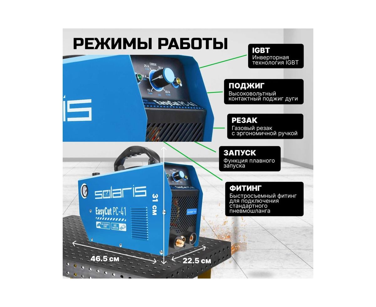 Плазморез SOLARIS EasyCut PC-41 используется для работы с различными токопроводящими материалами: углеродистая сталь, нержавеющая и оцинкованная сталь, алюминий, медь и пр. Устройство поможет выполнить резку металла с большой скоростью и высоким качеством среза. Высокочастотный поджиг дуги обеспечивает плавный и качественный старт. Одной из главных особенностей аппарата является регулировка продувки после резки до 20 секунд.