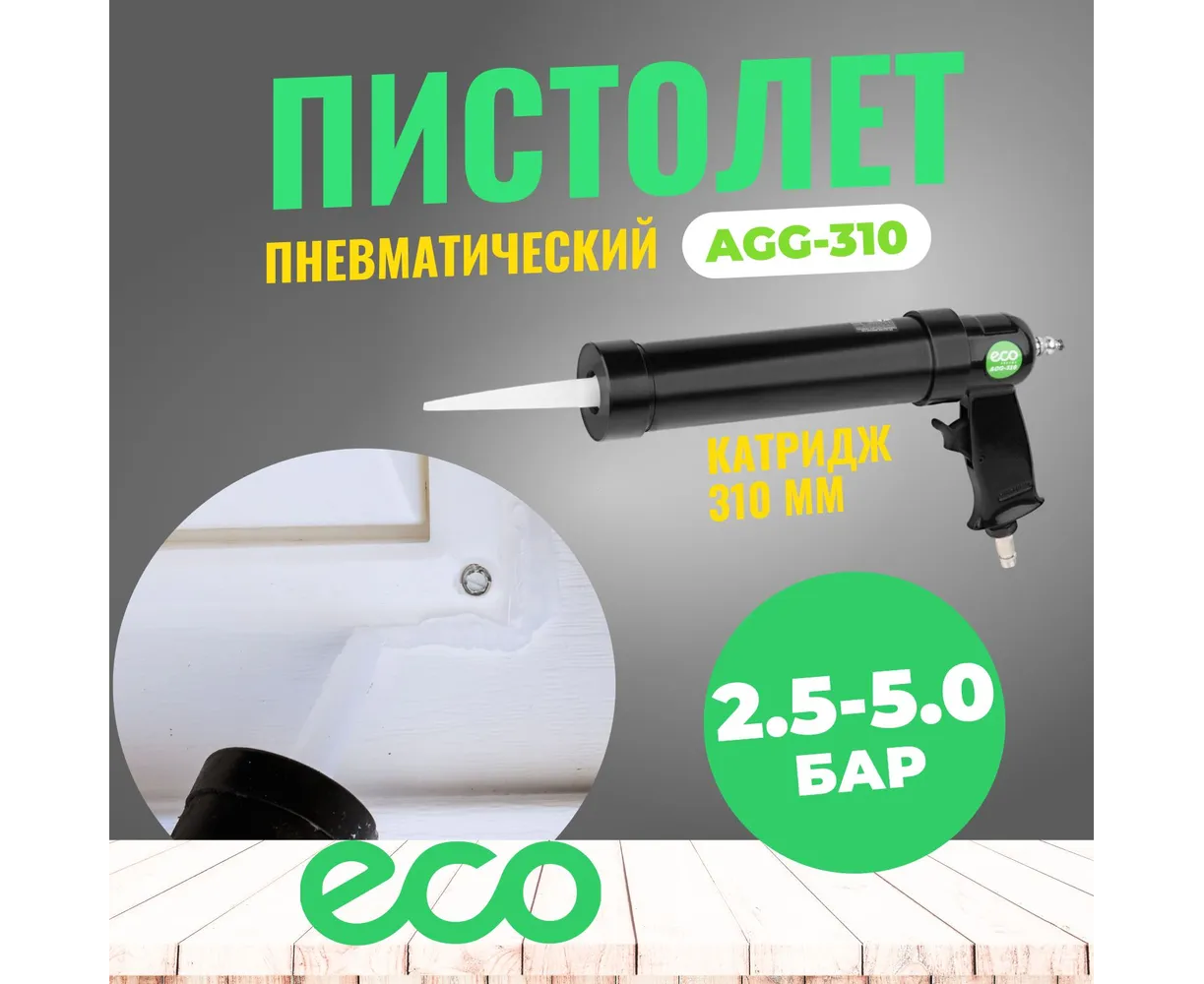 Пневмопистолет для герметика ECO AGG-310 используется для легкого и равномерного нанесения материалов с помощью источника сжатого воздуха (компрессора).