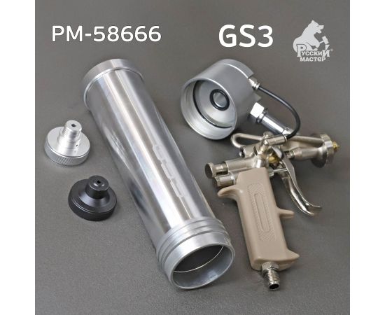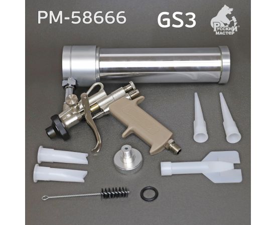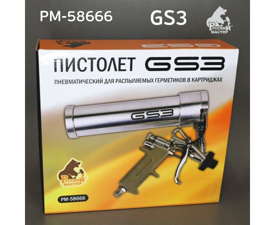 Пневматический пистолет Русский Мастер GS3 РМ-58666 предназначен для нанесения гибридных распыляемых и шовных герметиков, фасованных в картриджах объемом 310 мл.