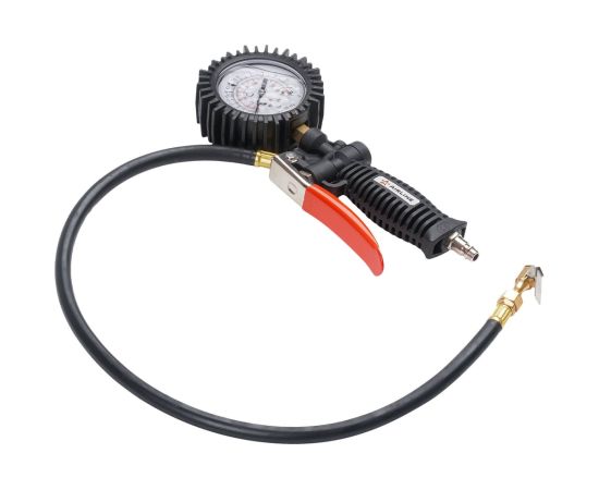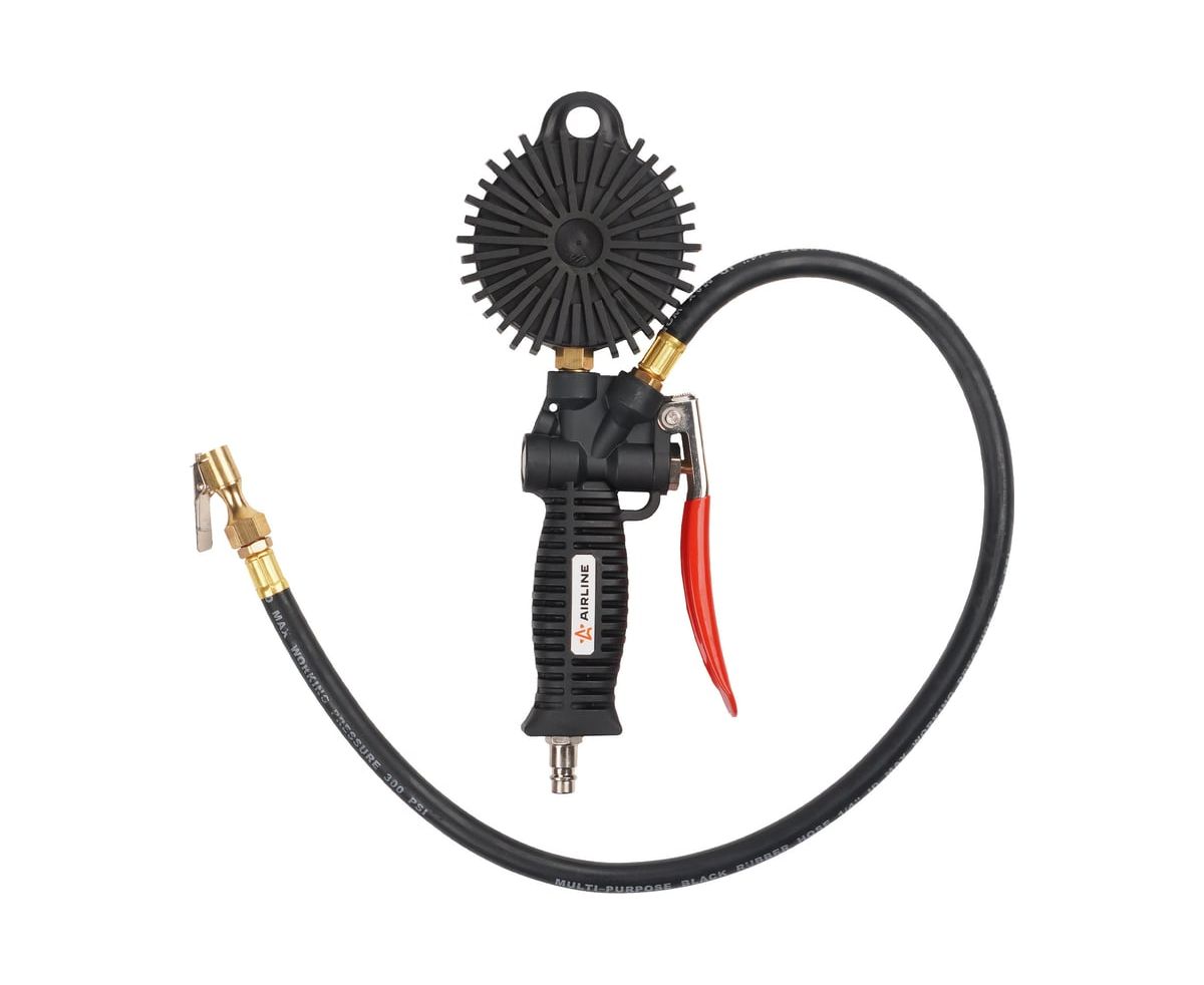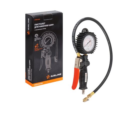 Пистолет для накачки шин с манометром 12 АТМ INDUSTRY AIRLINE ATBU040, корпус которого изготовлен из нейлона. Манометр защищён резиновым чехлом. Гибкий шланг имеет быстросъёмный наконечник. Конструкцией предусмотрена функция для сброса лишнего давления. В комплект входит присоединительный фитинг 1/4".