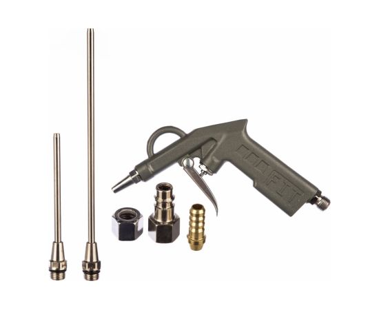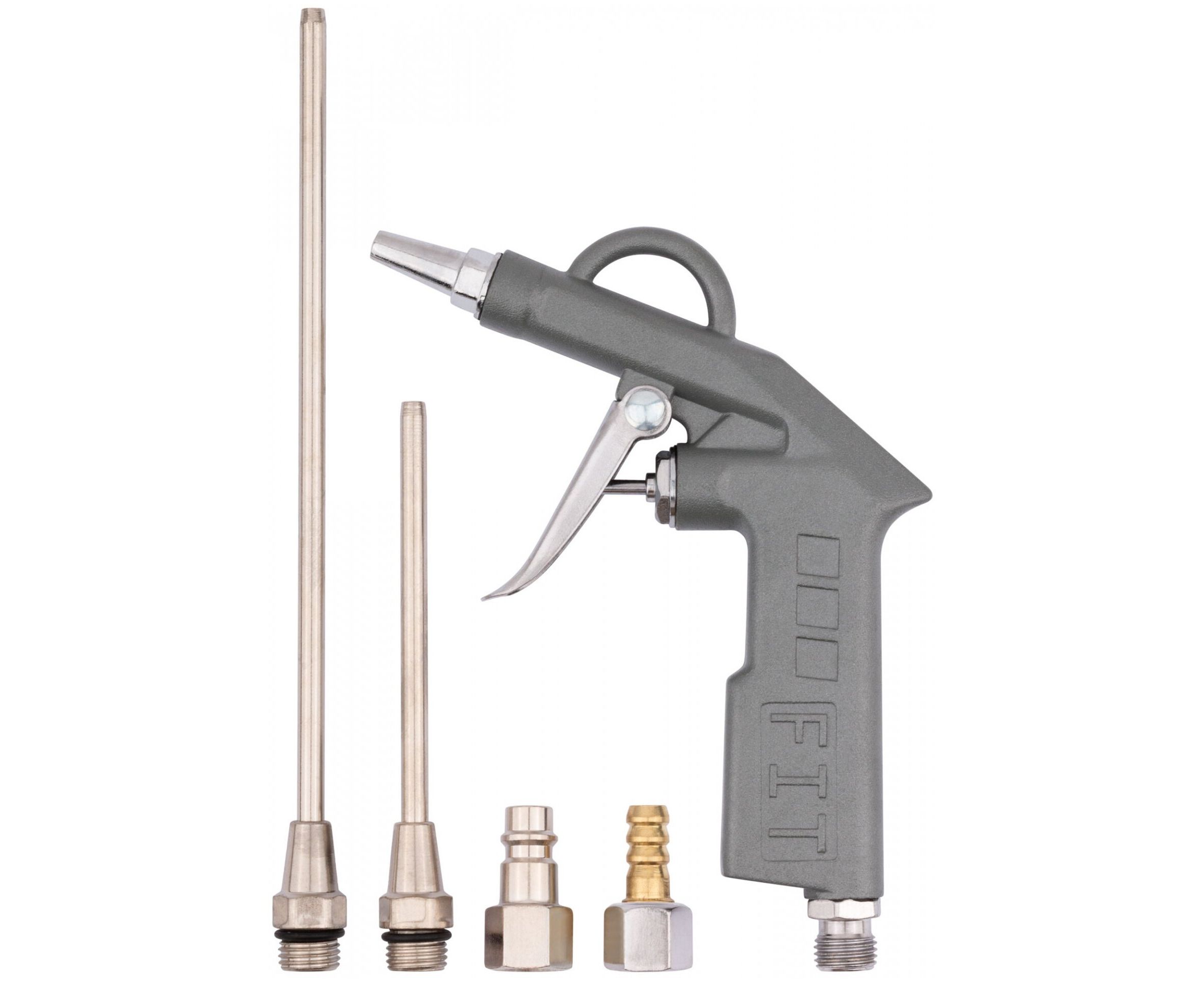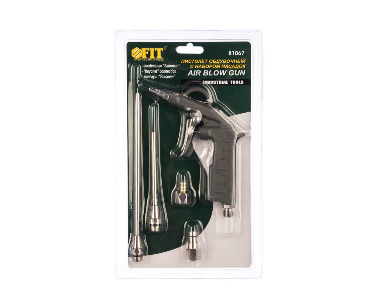 Обдувочный пистолет с набором насадок FIT IT 81067 используется для продувки и очистки различных поверхностей от пыли и загрязнений. Дополнительные насадки помогают добраться до труднодоступных мест. Сам инструмент выполнен из алюминия, насадки из латуни. Шланг подачи сжатого воздуха крепится с помощью соединения байонет.