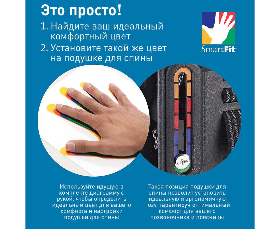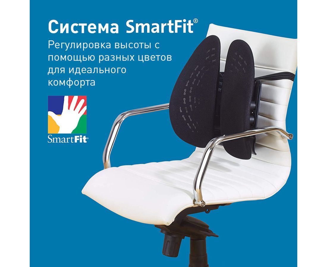 Эргономичная поддержка для спины. Система SmartFit обеспечивает индивидуальную регулировку высоты за 2 простых шага. 4 уровня высоты спинки. 2 независимые детали поддержки спины. Съемные тканевые чехлы; допустима машинная стирка. Прикрепляется к любому офисному креслу.