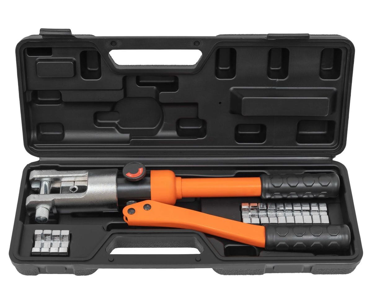 В комплекте кейс и 8 сменных матриц (10, 16, 25, 35, 50, 70, 95, 120 мм²), а также ремкомплект.