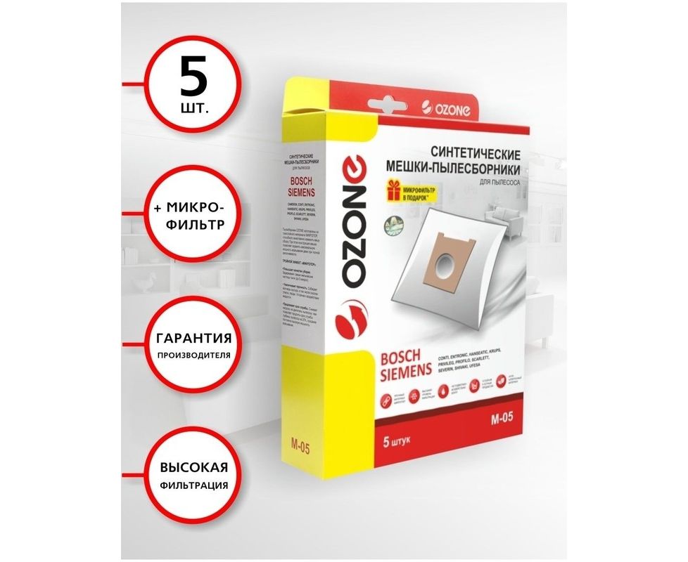 Мешки для пылесоса BOSCH (Бош), SIEMENS (Сименс), SCARLETT (Скарлет), KRUPS (Крупс), CONTI (Конти), PRIVILEG (Привилег), ENTRONIC (Ентроник), HANSEATIC (Хансетик), SEVERIN (Северин), PROFILO (Профило), SHIVAKI (Шиваки), UFESA (Уфеса). Мешки для пылесоса бренд OZONE, тип оригинального мешка: Typ G, синтетические. Мешок для пылесоса 5/10/15 шт. ВЫСОКИЙ УРОВЕНЬ ФИЛЬТРАЦИИ. Пылесборник для пылесоса одноразовый Ozone изготовлен из многослойного синтетического материала, способного качественно изменить вашу уборку. Пылесборник задерживает мельчайшие частицы пыли и мусора благодаря высокому уровню фильтрации. Мешок имеет ПРОЧНЫЙ МАТЕРИАЛ. Увеличенная прочность мешка, позволяет собирать все виды мусора, в том числе осколки стекла, гвозди, обеспечивая защиту внутренних элементов пылесоса. Мешки для пылесоса отличаются устойчивостью к воздействию жидкости. УВЕЛИЧЕННЫЙ СРОК СЛУЖБЫ. Снижают нагрузку на двигатель пылесоса, сохраняя постоянно высокую мощность всасывания и позволяют продлить срок службы турбины пылесоса. МИКРОФИЛЬТР В ПОДАРОК. Внутри каждой упаковки вложен 1 микрофильтр, своевременная замена которого позволит повысить качество уборки и эффективность работы техники.