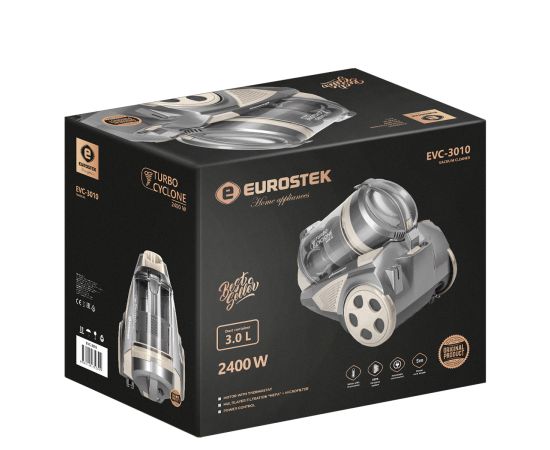 Пылесос без мешка Eurostek EVC-3010 технология МУЛЬТИ-Циклон, Многоуровневая система фильтрации: HEPA-фильтр+ микрофильтр, Максимальная мощность 2400 Вт., мощность всасывания 420 Вт., телескопическая металлическая трубка и щетка для пола, объем пылесборника 3 литра, длина шнура 5 метров, защита от перегрева, автоматическая смотка шнура, мотор с термостатом