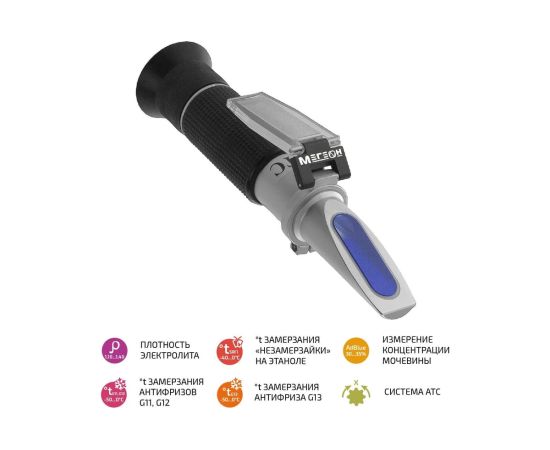 Рефрактометр для автомобилистов МЕГЕОН 72013 к0000018699 помогает определить показатель преломления света в исследуемой среде. Используется для измерения температуры замерзания антифриза, теплоносителя, хладоносителя, омывающей жидкости, измерения плотности электролита и концентрации мочевины (AdBlue).