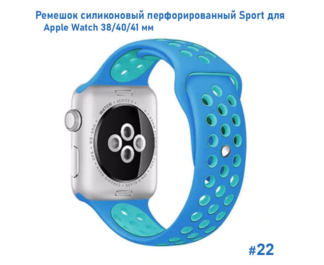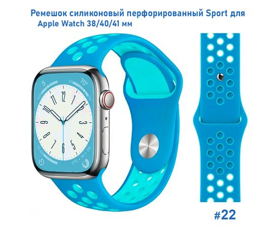 Ремешок силиконовый перфорированный Great Case Sport NK для Apple Watch 38/40/41 мм, 225мм, на кнопке, голубой+бирюзовый (22)