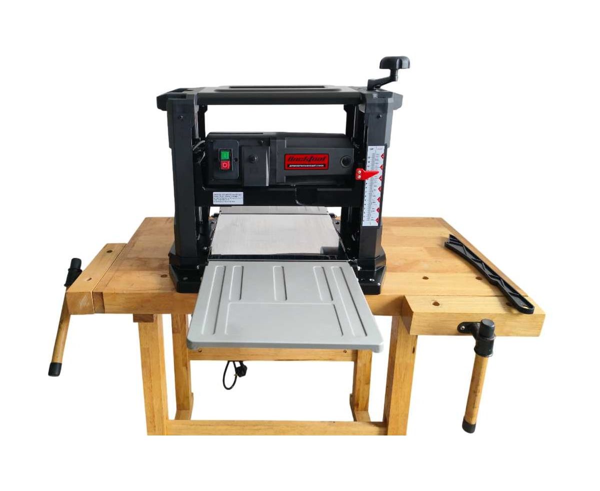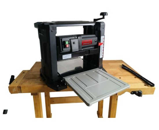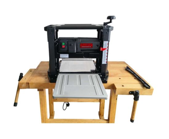 Рейсмусовый станок PT330A — это решение для профессиональной обработки пиломатериалов. Станок способен строгать доски шириной до 330 мм и толщиной до 152 мм, превращая грубую древесину в идеально ровные заготовки с гладкой поверхностью. Мощный 1800-ваттный двигатель раскручивает ножевой вал до 9500 оборотов в минуту, обеспечивая высокую скорость подачи 7.5 м/мин и чистую обработку без сколов. Встроенная шкала позволяет точно выставлять толщину, а два 100-мм патрубка для пылеудаления эффективно отводят стружку. Компактная конструкция с удобными ручками для переноски делает PT330A отличным выбором для столярной мастерской.