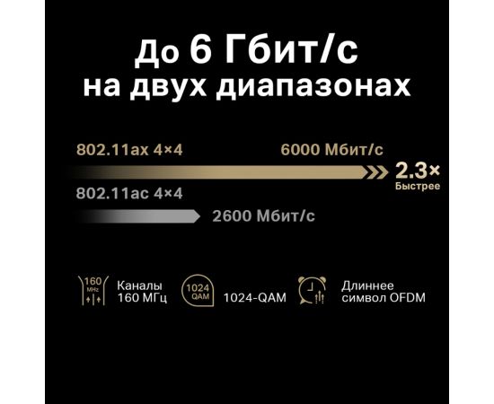 До 1148 Мбит/с на 2,4 ГГц, до 4804 Мбит/с на 5 ГГц