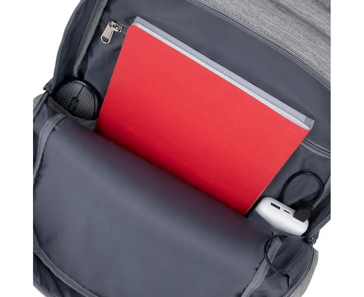 Просторное основное отделение имеет карман на молнии для паспорта и бумажника и два кармана на дне рюкзака - один для мыши, второй для повербанка. На боковой стороне рюкзака имеется USB-порт для подключения портативного внешнего аккумулятора к смартфону.