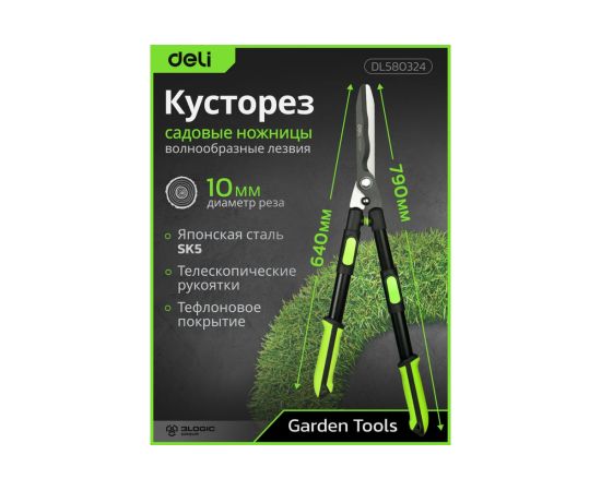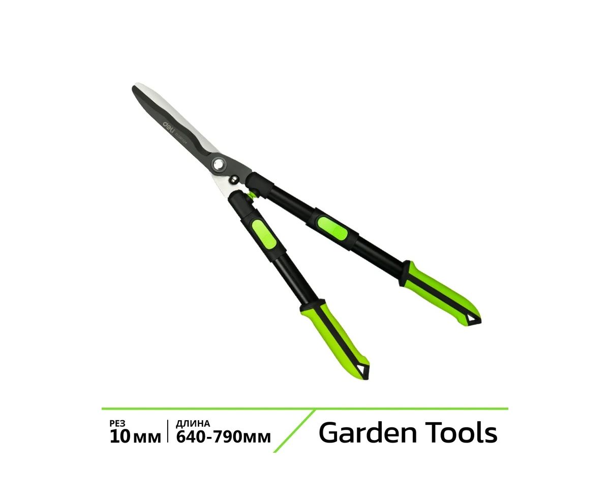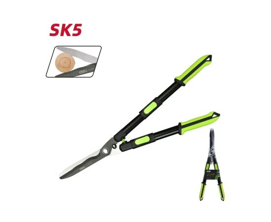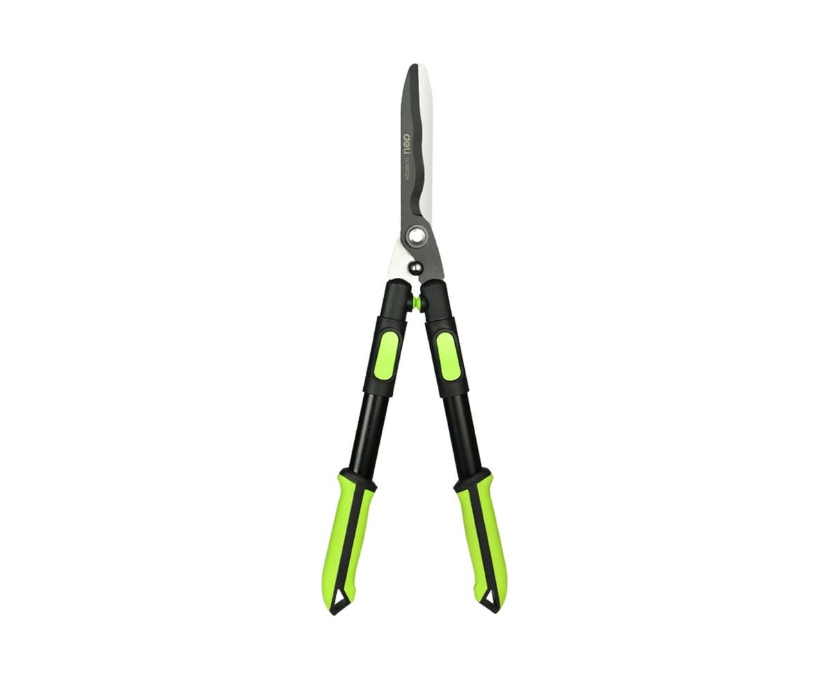 Телескопические рукоятки ножниц Deli DL580324 имеют четыре ступени регулировки длины, что делает их универсальными для пользователей различного роста и удобными для работы в труднодоступных местах.: