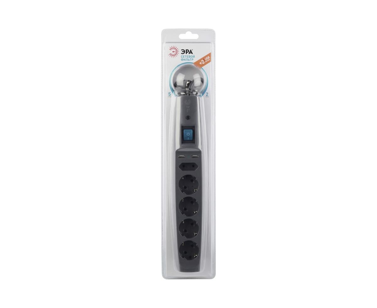 Сетевой фильтр 5 розеток, 2 USB, 2м, с/з, шторками и выключателем, черный, SFU-5es-2m-B ЭРА C0043326 отличается многофункциональностью, что делает его необходимым атрибутом современного дома. Сетевой фильтр имеет шнур длиной 2м, такой удлинитель оптимальный для использования в пределах одной комнаты. Для большего удобства он имеет выключатель.