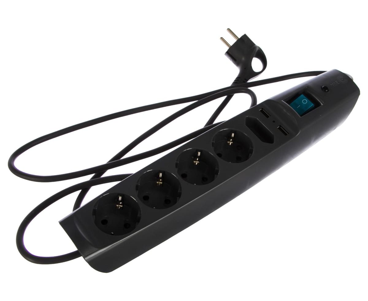 Сетевой фильтр ЭРА имеет 4 розетки классической круглой формы, узкое гнездо для зарядных устройств, 2 USB-порта с напряжением 2.1 А, что обеспечивает быструю зарядку мобильных устройств.