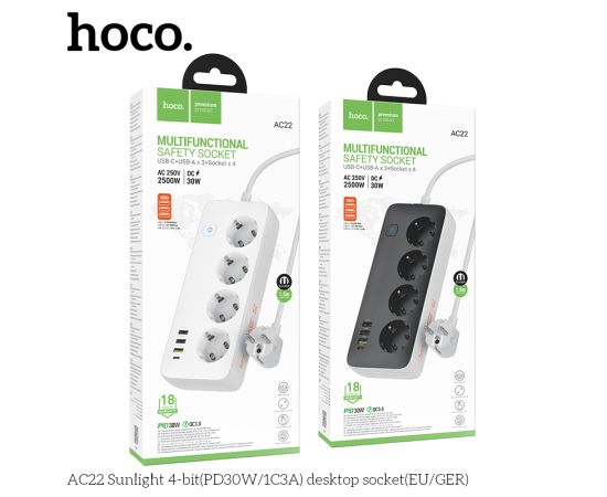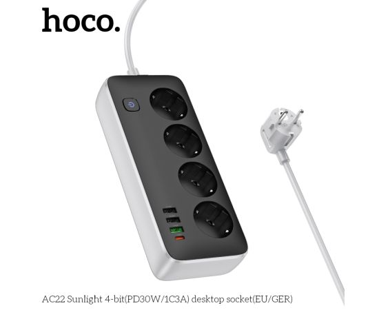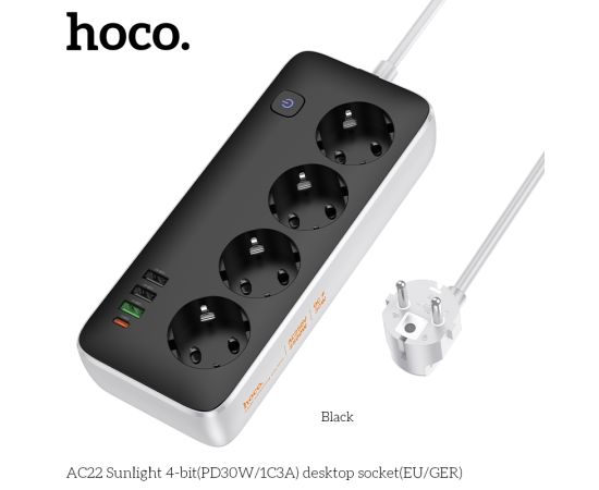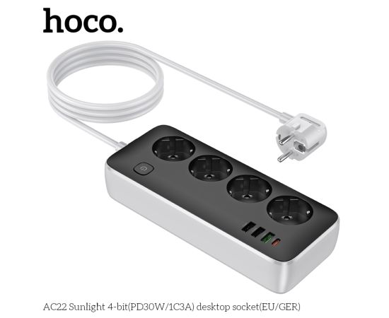 Сетевой фильтр HOCO AC22 Sunlight 4-bit (PD30W/1C3A) (L=1.5M) (черный)