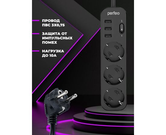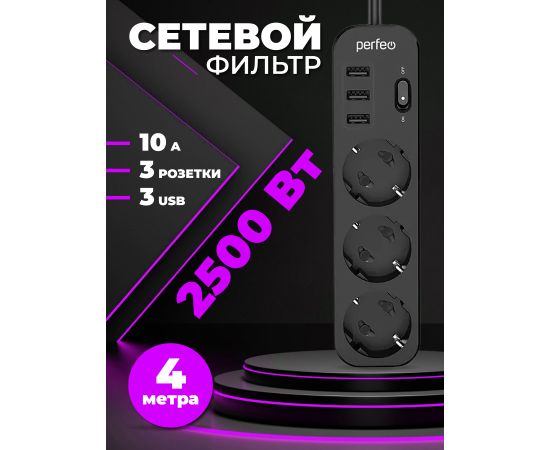 Сетевой фильтр Perfeo "POWER STREAM", 2500W, двойная защита, 4м, 3 розетки, 3 USB, черный.