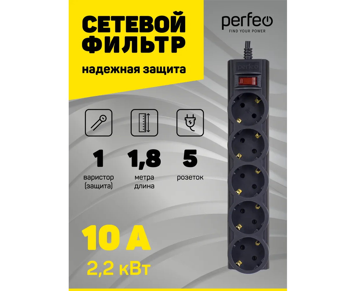 Сетевой фильтр Perfeo "POWERX", 1,8м, 5 розеток, черный