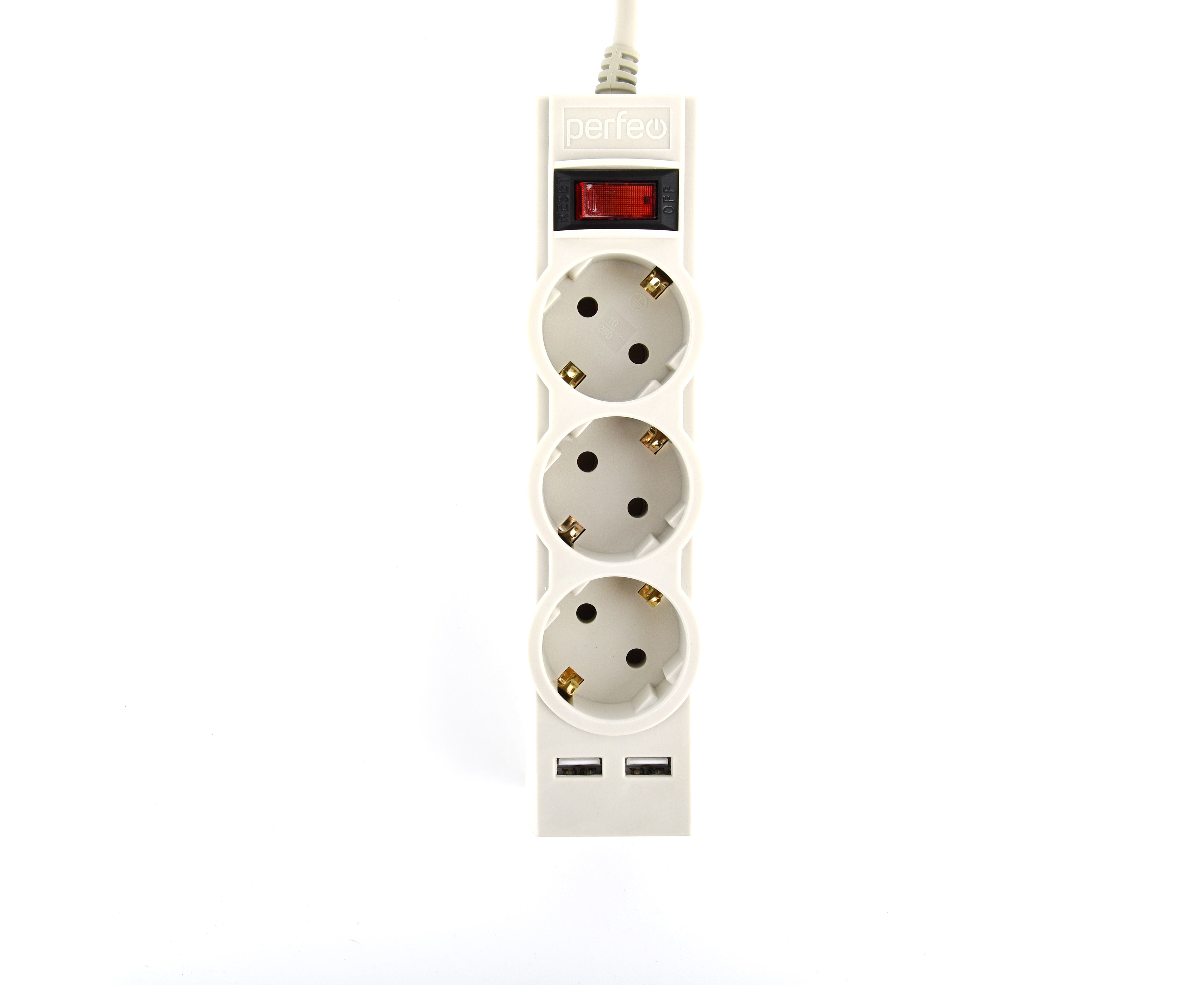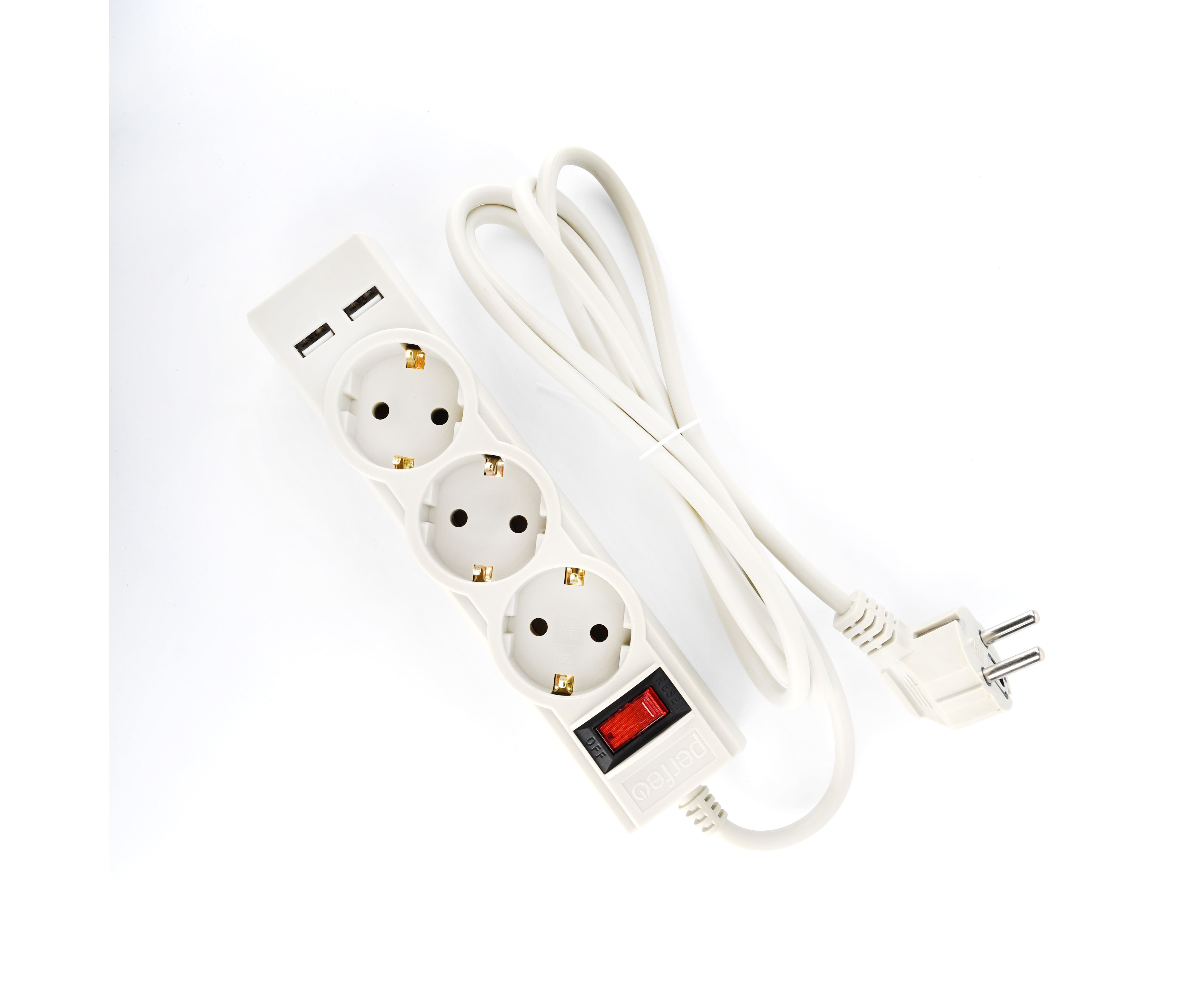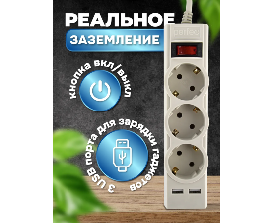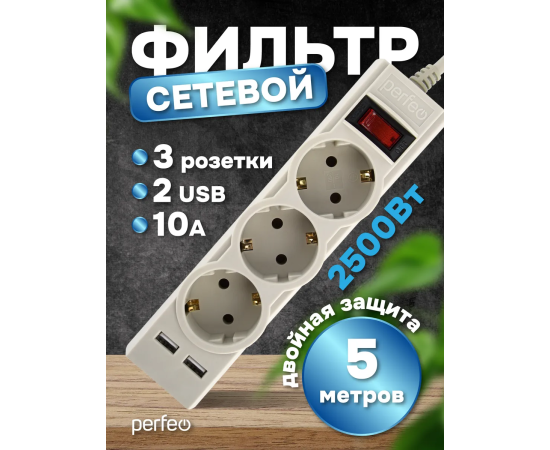 Сетевой фильтр Perfeo "POWER-S", 5,0м, 3 розетки 10А, 2USB, 2500 Вт, двойная защита, белый