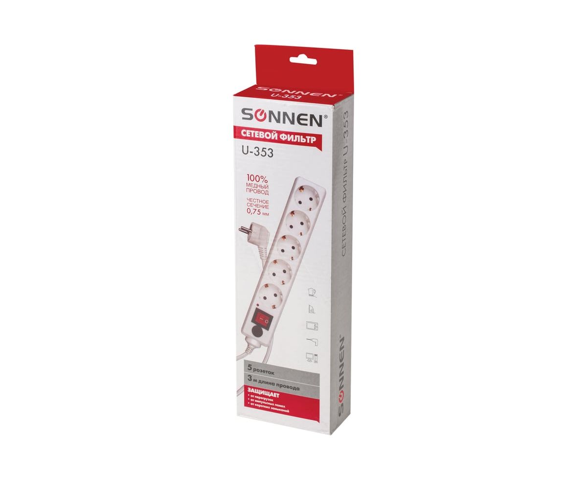 Сетевой фильтр SONNEN U-353 (511425) 5 розеток, с заземлением, выключатель, 10 А, 3м белый