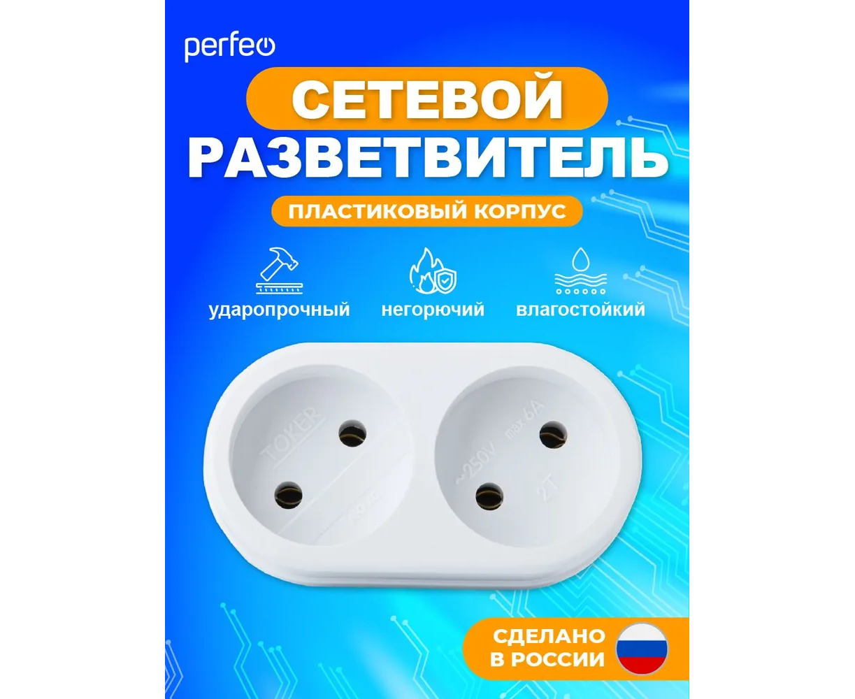 Сетевой разветвитель Perfeo "RU POWER'' 2 гнезда, 6А, без заземления, (2Т), белый