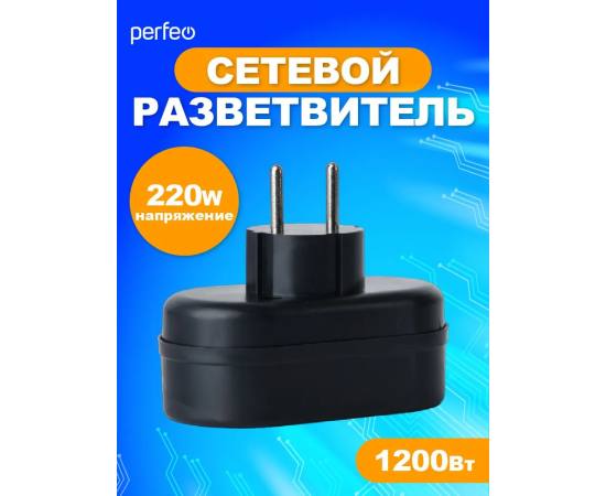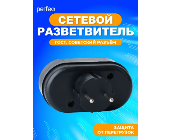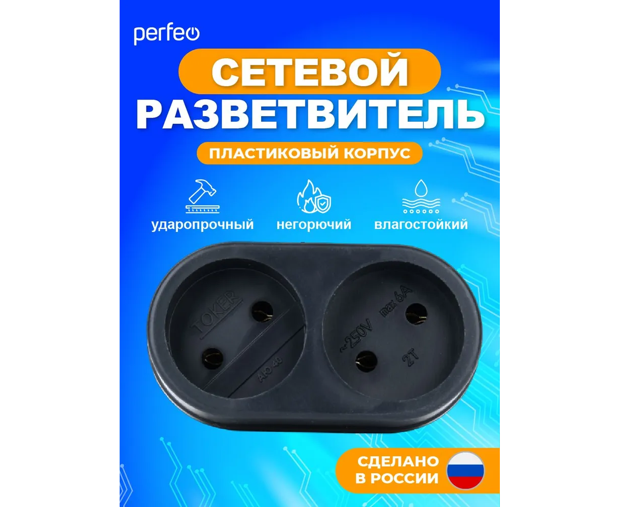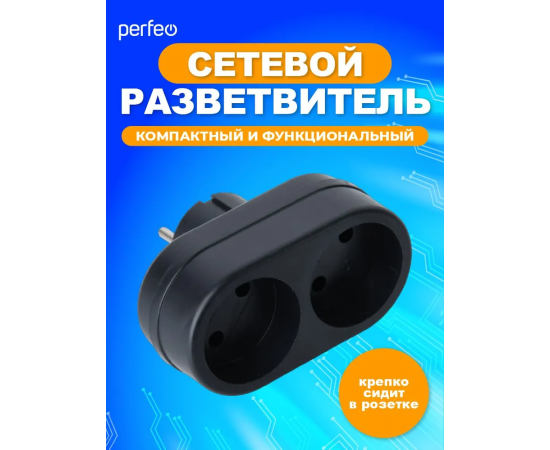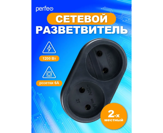 Сетевой разветвитель Perfeo "RU POWER'' 2 гнезда, 6А, без заземления, (2Т), черный