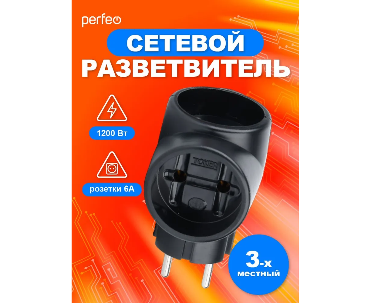 Сетевой разветвитель Perfeo "RU POWER'' 3 гнезда, 6А, без заземления, (3Т), черный