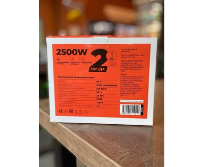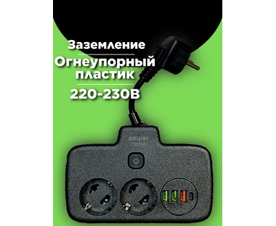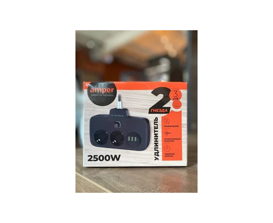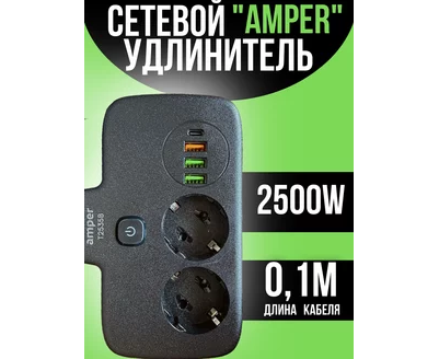Сетевой удлинитель Amper, 0,2м, 2 розетки, 3*0,75мм, 10А, 2500 Вт, 3usb, 1Type-C, 1кн, черный