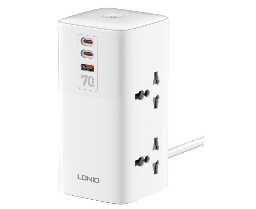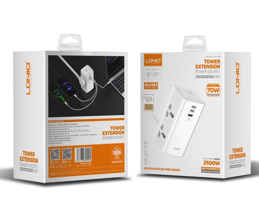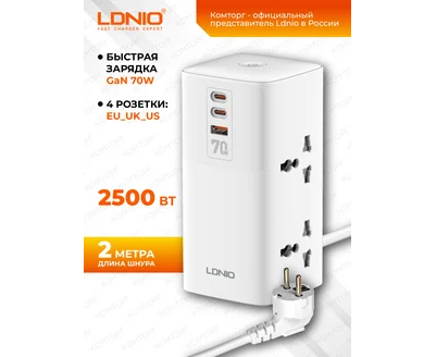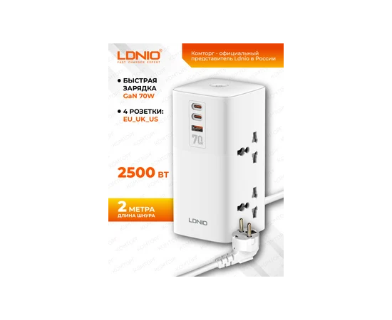 Сетевой удлинитель LDNIO SC4383/ 2м/ 4 розетки/ 3 USB: QC 5.0+PD 3.0+PPS/ GAN 70W/ белый