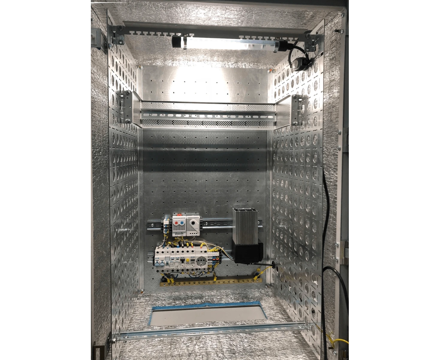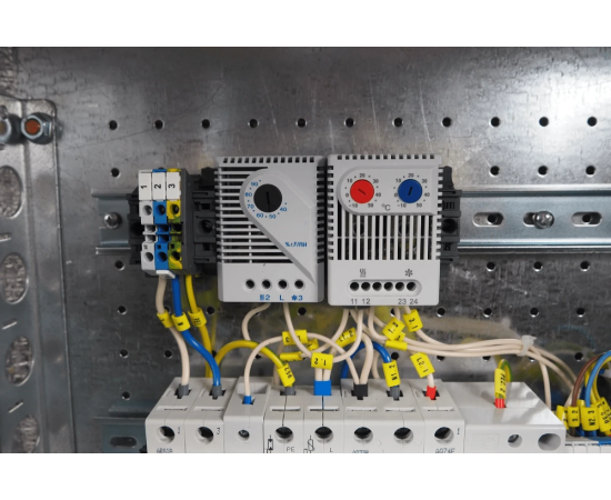 шкаф, нагреватель полупроводниковый, разрядник перенапряжения, индикатор напряжения, гигростат, термостат, выключатель дифференциальный защитный, выключатель автоматический, датчик открытия двери, розетка на DIN-рейку, шина заземления