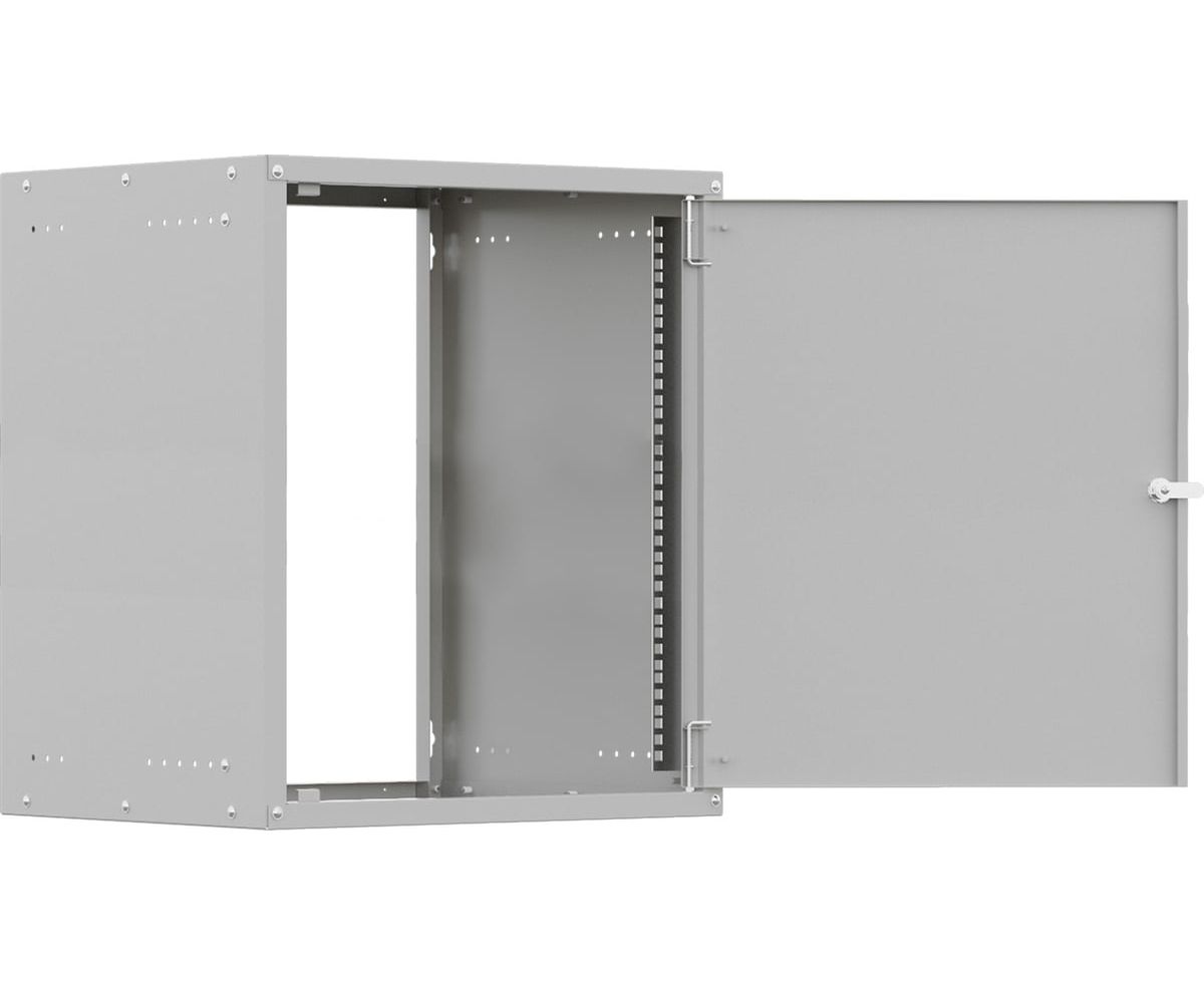 Разобранный настенный шкаф NTSS серии «W» с передней дверью, открываемыми боковыми стенками на защелках, задней стенкой и панелями пола и потолка. В комплекте 1 пара 19” профилей, уголки для поддержки оборудования. Наличие стальной глухой двери добавляет дополнительную механическую защиту и ограничивает осмотр содержимого шкафа.
