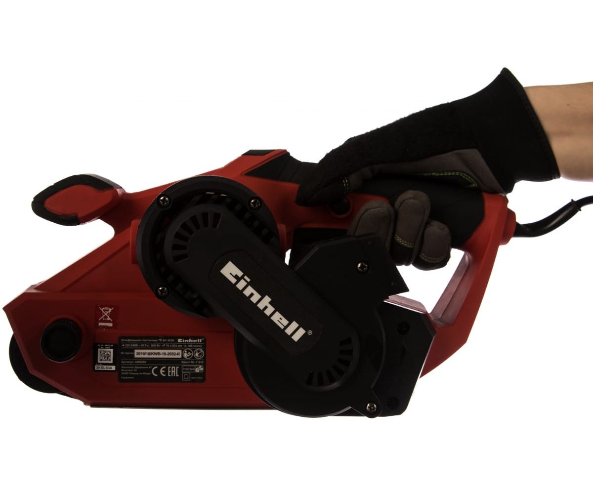 Ленточная шлифмашина Einhell TC-BS 8038 имеет две рукояти для плотного прижима к обрабатываемой поверхности. Все рабочие узлы закрываются корпусом, который защищает их от загрязнения и механических повреждений. Для замены оснастки ключ или любой другой инструмент не требуются. Размер оснастки - 76х533 мм.