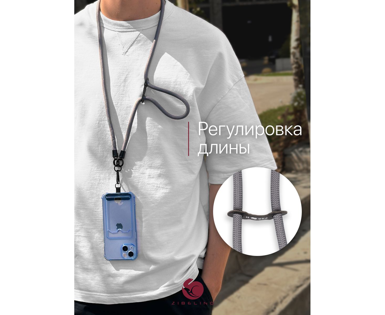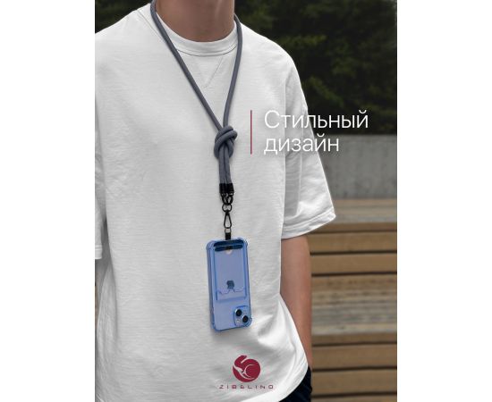 - Регулируемая длина. Шнурок можно носить разными способами: на шее, через плечо, на руке, на запястье или как кросс боди для телефона. Длина регулируется при помощи петли для аксессуаров.