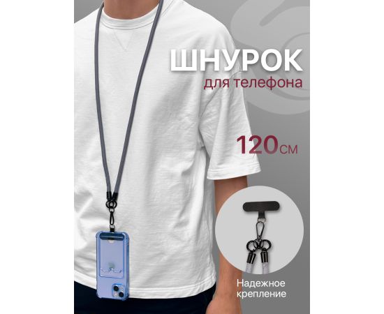 Шнурок универсальный 120см: для телефона на шею, для ключей, бейджа, пропуска, ремешок веревка через плечо, на руку, с карабином нейлоновый регулируемый, серый